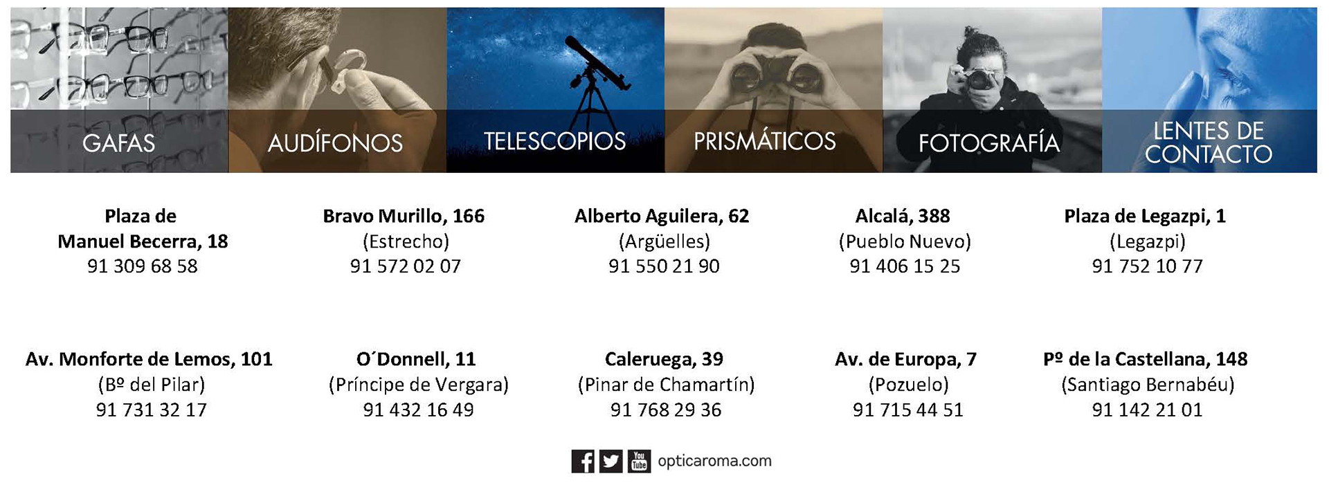 Óptica Roma es una empresa familiar fundada en 1965, con sus orígenes en la plaza de Manuel Becerra 18 (antigua plaza de Roma), en Madrid, dirigida actualmente por la tercera generación de Ópticos-Optometristas. Desde sus comienzos la filosofía de la empresa ha sido muy clara y constante, basada en ofrecer a sus clientes la mejor solución a cada problema visual, desde un punto de vista profesional y con la ayuda de la mejor tecnología de cada momento, ofreciendo una gran variedad de productos, siempre de alta calidad y a unos precios competitivos.